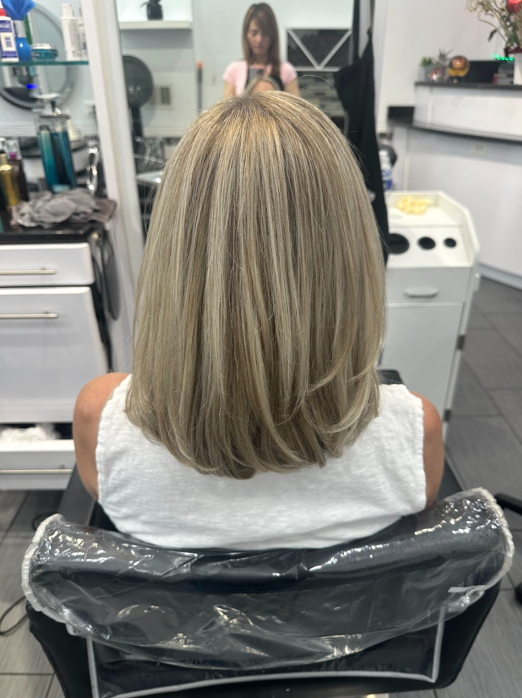 A warm blonde layered with darker hues and highlights created in Wish Salon and Nails